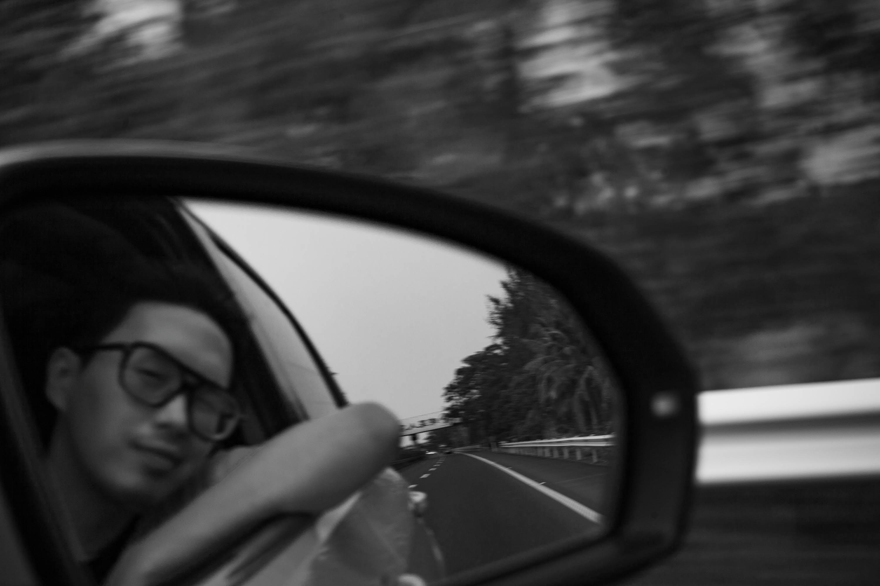 Palm shadows slice the windshield,